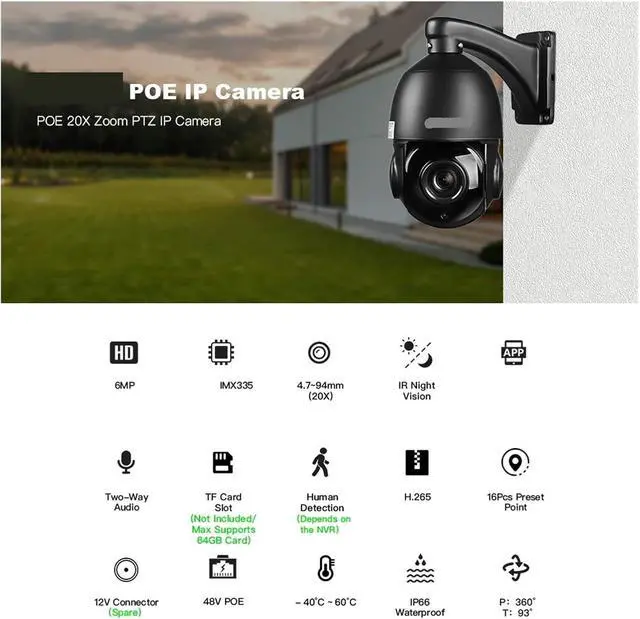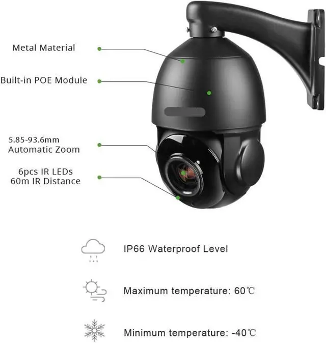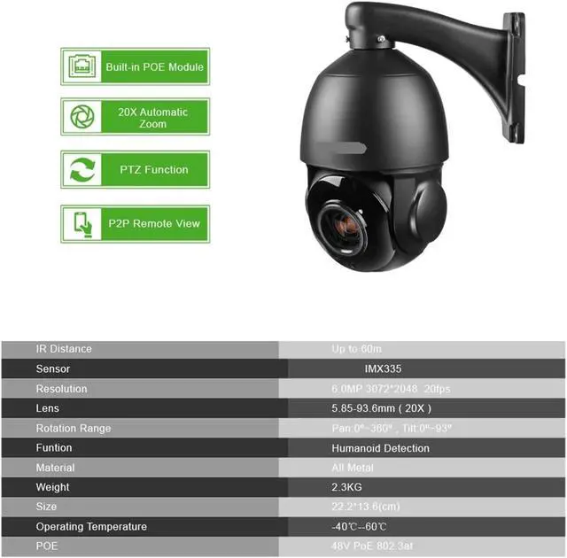 6 million pixels ultra-clear + 20x optical zoom, precisely capturing details at extremely long distances: Equipped with high-definition IP digital interface, the enlarged image remains clear and sharp, enabling effortless capture of subtle movements at long distances outdoors, meeting the needs of extensive security protection.
