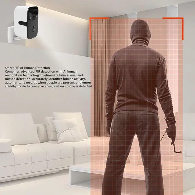 Accurate Motion Detection: Utilizing advanced PIR detection and AI human shape recognition, the camera offers precise detecting without false alarms. It records when it detects human activity and remains in standby mode to save energy when idle.