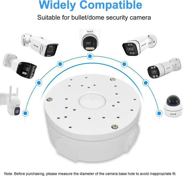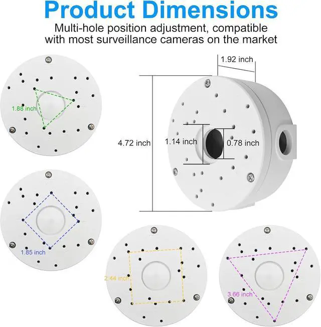 Easy to install: Universal bullet security camera junction box mount bracket installation does not require any professional tools or cumbersome steps. Use the included screw bag, open the cover, wiring, and close the cover, and get it in three steps! Whether it is walls, columns or ceilings, just fix the box, you can easily integrate this surveillance camera mount into your surveillance system, saving time and effort. Size: Diameter 4.72inch, Height 1.92inch.