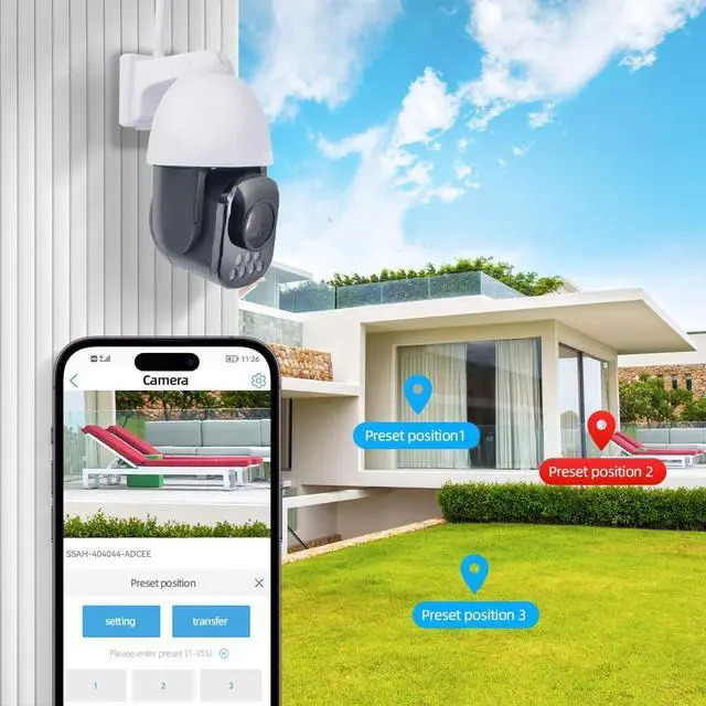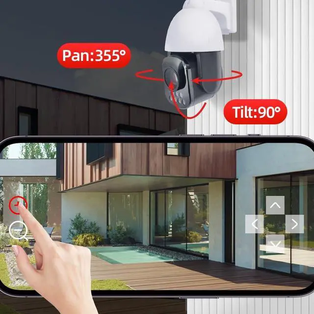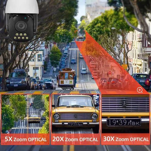 5.0 Megapixels, 30X optical zoom with auto-focus, 2560x1920 resolution, zoom in/out to see clearer details. PTZ rotation: horizontal pan 355°, vertical tilt 90°. Support Onvif 2.4, work with NVR, Blue Iris, support RTSP, DDNS settings. Support 2.4GHz, 5GHz dual WiFi, and Bluetooth connection.