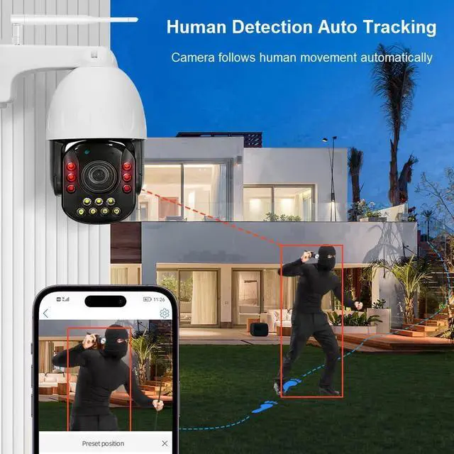 Motion Detection, Auto Tracking: Push real-time alert notifications to App, send pictures to email, save pictures and record video to TF card, FTP server, trigger siren alert. Support motion detection and humanoid detection auto tracking, can follow human movement automatically.