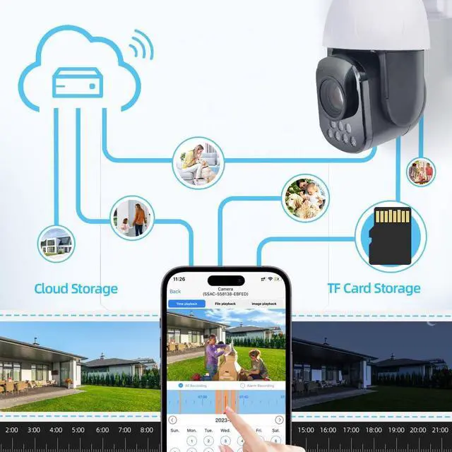 Memory Card, Cloud Storage: Built-in TF card slot, support max 256GB TF Card(not included) for detection alarm recording, timing recording, 24/ 7 loop recording, intelligent playback remotely etc. Automatically overwrite the earliest record file when SD card is full. Support cloud storage.