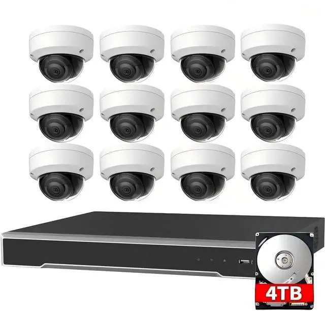 12 x 4MP IR Dome Cameras with 100ft Night Vision: This comprehensive kit includes 12 outdoor-ready 4MP vandal dome cameras. A 2.8mm lens for wide-angle views, they deliver sharp, detailed video day and night. With an impressive infrared range of up to 100 feet (30 meters), your property stays protected in complete darkness.
