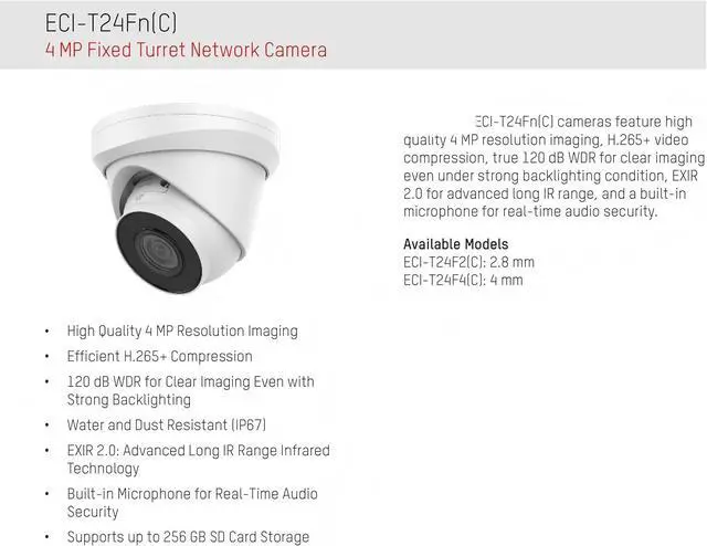 4MP Fixed Turret Network IP Camera. Efficient H.265+ compression technology. Clear imaging even with strong back lighting due to 120 dB WDR. EXIR 2.0: advanced infrared technology with long IR range