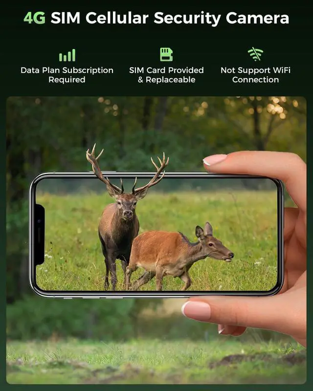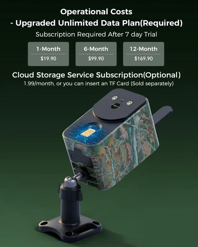 4G SIM Card ConnectionNo WiFi SupportThis 4G Lte Cellular Security Camera operates via 4G SIM card, no WiFi required. Suitable for remote or off-grid areas like villages, gardens, campsites, second homes, farms, barns, wildlife observation spots. Includes 7-day initial SIM data for testing; later, required subscription to 4G unlimited data plan (19.9/month) via XEGA App. No SIM Card Slot. Only Support the Build-in SIM Card and the SIM Card Cannot be Replaced.