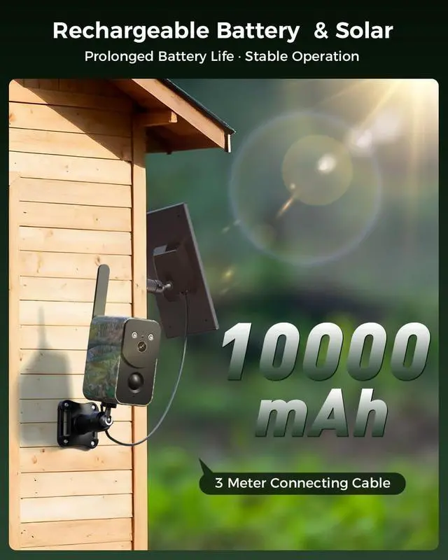 Long Battery LifeCamouflage Design10000mAh battery, lasting up to 45 days with moderate use. With a 3W solar panel, manual charging is mostly unnecessary, solving power issues in outdoor/remote areas. Supports desktop placement + wall/tree mounting (APP-controlled rotation & auto-rotation not supported). No professional tools or skills needed - saving professional installation costs. Camouflage body is hard to detect outdoors, enhancing monitoring concealment for greater peace of mind.