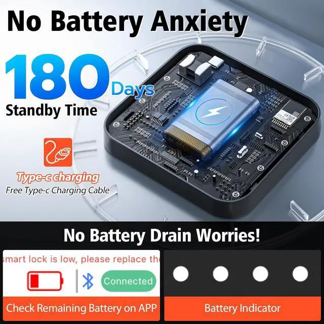 Long-Lasting Rechargeable Battery110mAh lithium battery = 6 months standby + 2000 unlocks per charge. Low-power design + USB-C cable for fast recharging. No more dead lock worries power lasts as long as your security needs.