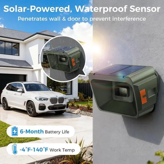 Solar Power & Weatherproof SensorOur driveway alarm is built for all-weather use, the solar-powered sensors last up to 6 months on a full charge. The weatherproof shell resists rain, snow, and extreme temperatures (-4 to 140), No wiring needed - ensure year-round protection.ideal for driveways, gates, or outside barns in any weather.