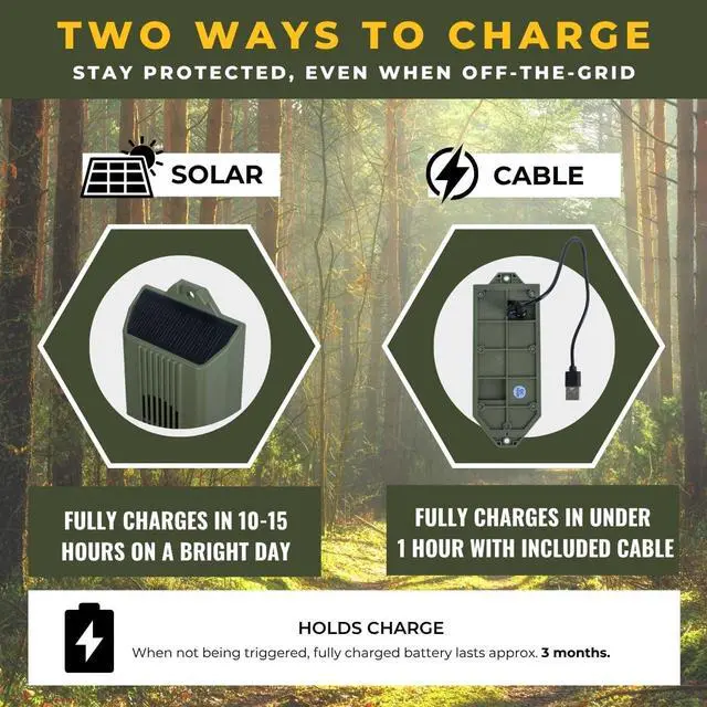 No Ammo Required: Safer and simpler than traditional primer trip alarms; TACTIKO is rechargeable via solar or USB; no blanks needed; compliant for everyday use