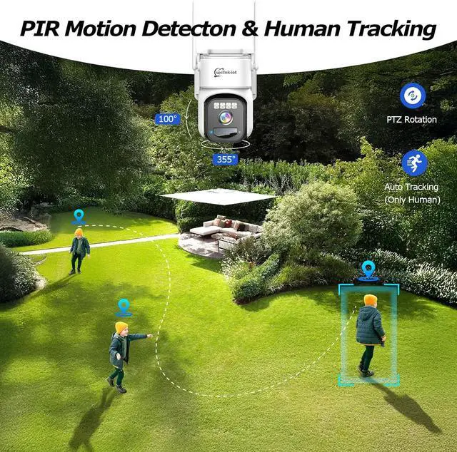 Human Tracking & Spot MonitoringWhen the human tracking function is turned on, the Cellular camera can automatically rotate to track and record the movement of the intruders (the motion detection also needs to be kept on), and automatically turn back to the preset monitoring position after the intruders leave the monitoring area 60 seconds (the guard position needs to be preset in advance in the APP)