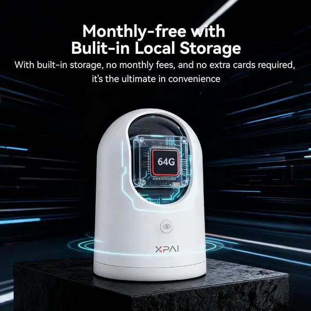 Industry-First Built-in SD Slot & No Monthly Fees: Chip with 64GB built-in storage, eliminating cloud fees while keeping baby/pet videos secure and accessible.With no monthly fees required, this camera for home security offers a cost-effective solution for your home security needs. Record continuously or store event-based clips for added convenience.