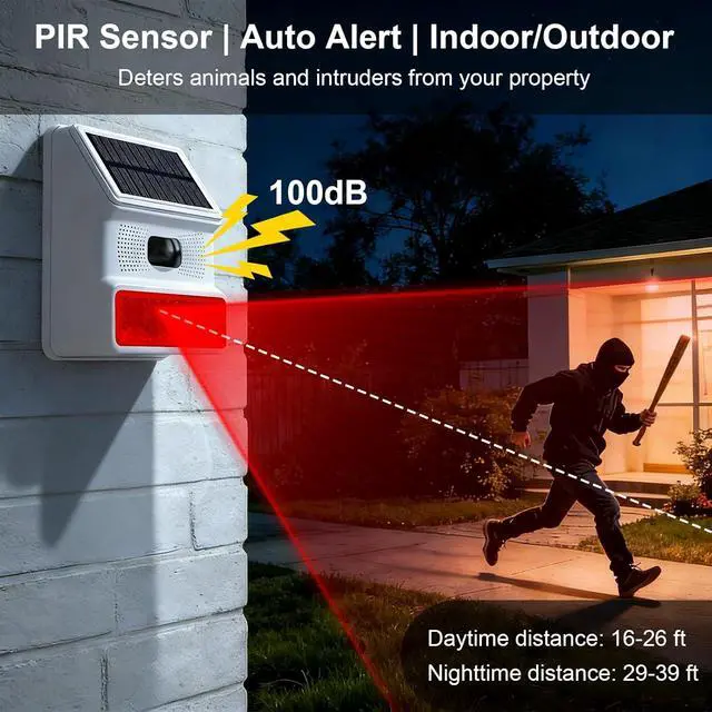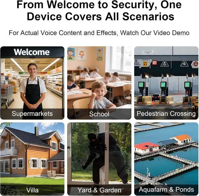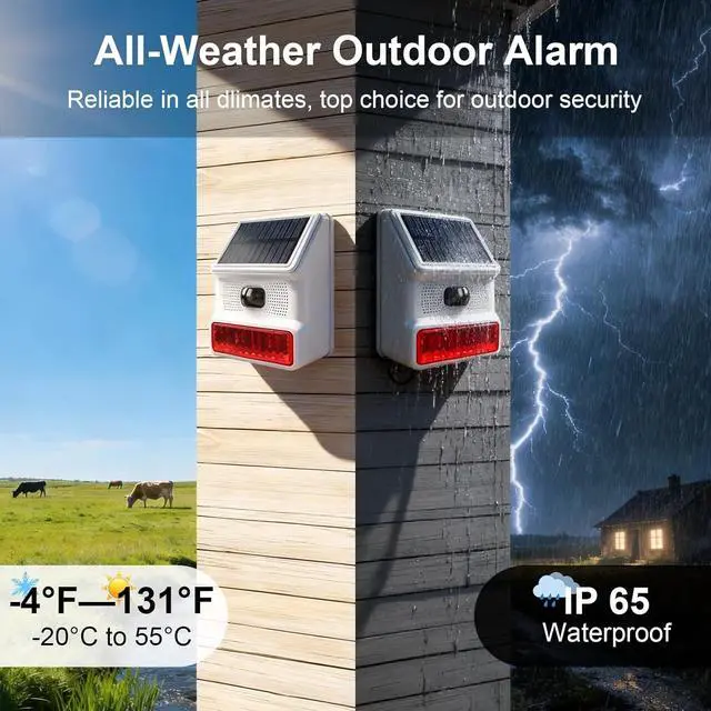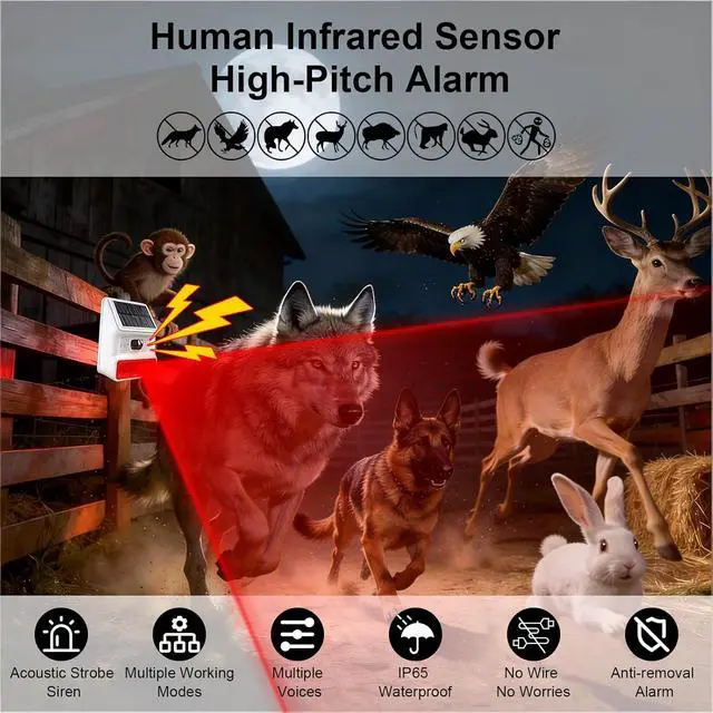 Waterproof, Dustproof & Fire-Retardant BuildThis solar motion detector alarm features 14 cycling sound effects; real audio is in the homepage product video.It effectively deters animals and intruders from approaching your property, providing reliable protection for your garden, yard, orchard, livestock and farm. Besides, it can also alert the public to potential dangers, restrict unauthorized activities, and maintain public order and safety.