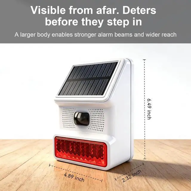 Wide Detection & Loud AlarmWith a 110° detection angle and max 16-39ft range (affected by installation height & ambient light), the driveway alarm triggers a 100dB alarm and strobe light. Its large size enables early intruder warning, wider-range strong light alerts, and effective deterrence in yards, farms, crossing or warehouses