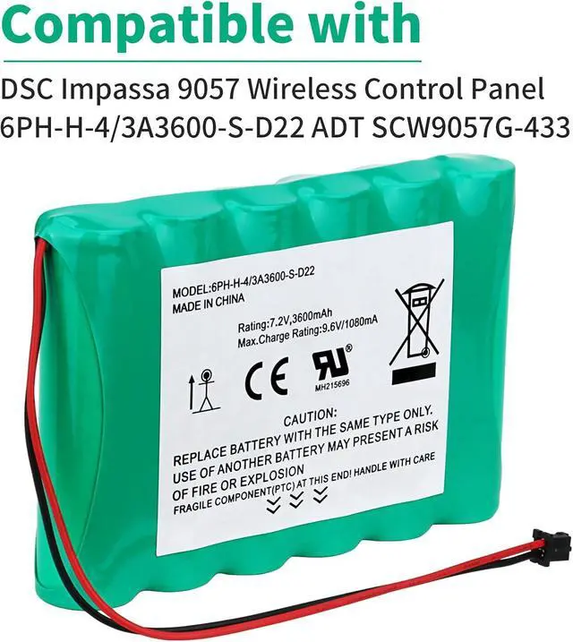 This replacement battery will fit ADT branded DSC Alarm panels, Replacement Battery Compatible with 6PH-H-4/3A3600-S-D22 7.2v 3600mAh Ni-MH DSC IMPASSA 9057 Battery Wireless Security System ADT SCW9057G-433