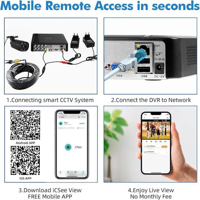 Local or Remote Access & Free APPRemotely access and play surveillance footage and control the security DVR with no contract or monthly fees with app.View and control your security system locally by connecting the system to a monitor without internet, or via free VMS Client software on tablet, PC, or via Smartphone APP (XMEye or icsee ) on mobile devices remotely.You can also playback significant evidence or funny videos records by searching different days, hours or minutes.