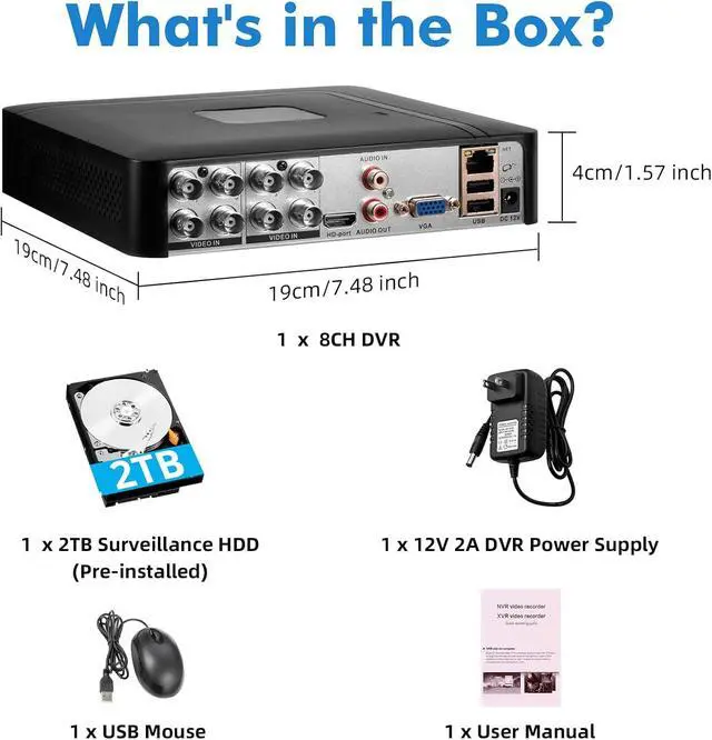 Smart Motion Detection and Instant AlertsThe system can detect anything unusual with the advanced algorithm and push real-time app notification and email alerts with snapshots, when there are motion events. Access the system directly to see the motion-triggered events and take actions at once to prevent the intrusion.Package Included:1x 8ch dvr recorder,2TB(Pre-installed on DVR).Suitable for Home, supermarket, school, store, office, parking, hotel, etc.