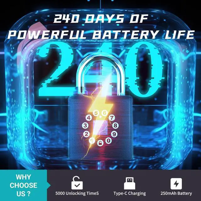 LONG BATTERY LIFE & USB-C CHARGEABLEGS55S padlock has low power consumption and long standby time. The rechargeable battery can support half a year of standby and over 2400 times of unlocking. When the door lock is dead, it can be charged using a USB-C cable.