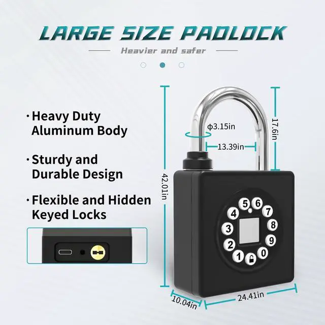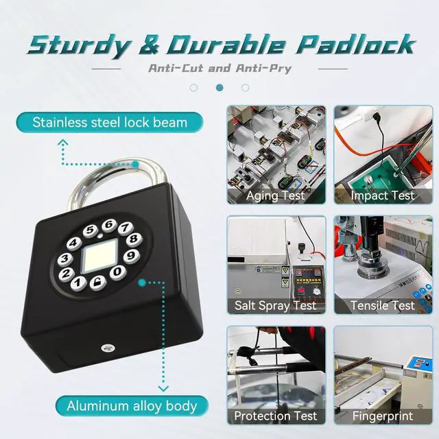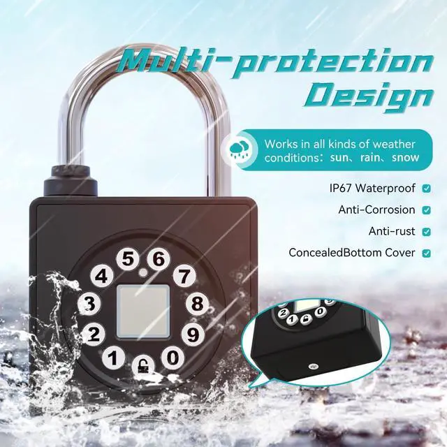 RUGGED CONSTRUCTION & SECURITYThe SFW fingerprint padlock is made of sturdy aluminum alloy material, the stainless steel padlock beam further enhances the durability of the padlock, which can resist rust, cuts and water.