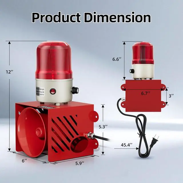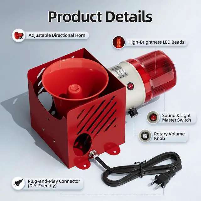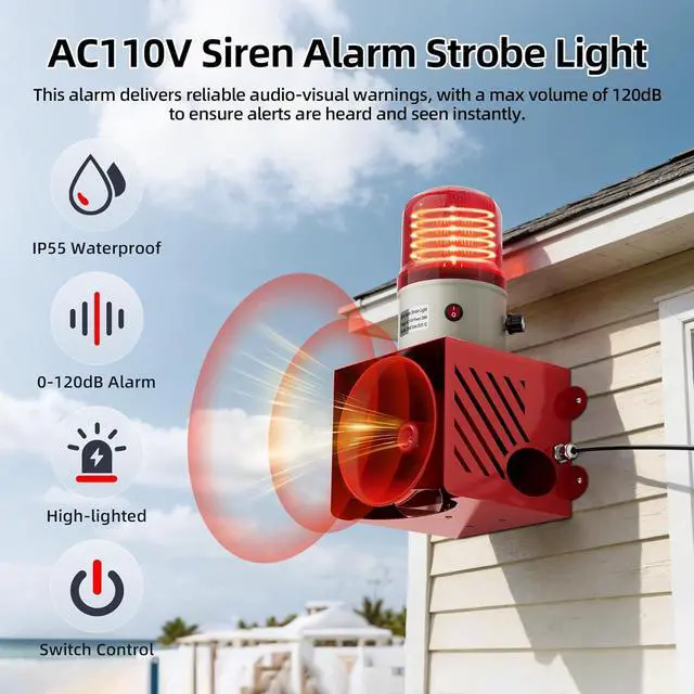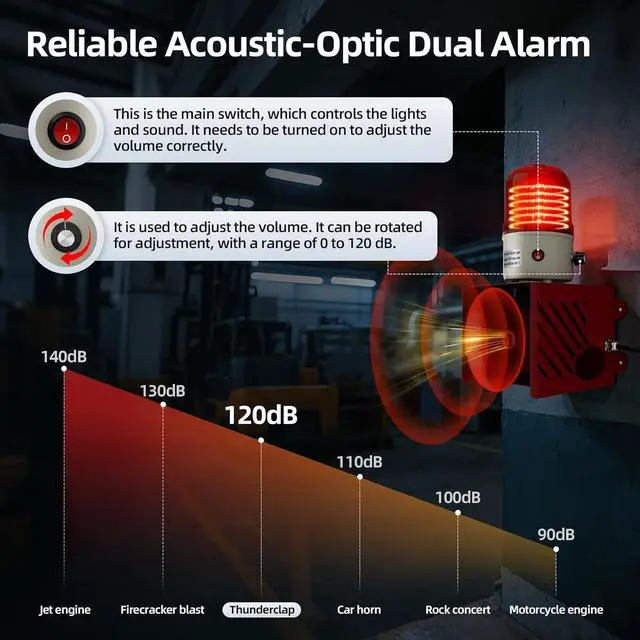 Convenient Control & Volume Adjustment - This AC110V siren alarm has an integrated master switch to turn the sound and light alerts on or off with one key. A rotary volume knob allows flexible decibel adjustment, letting you match the alarm volume to specific scenario needs without causing unnecessary noise disturbance.