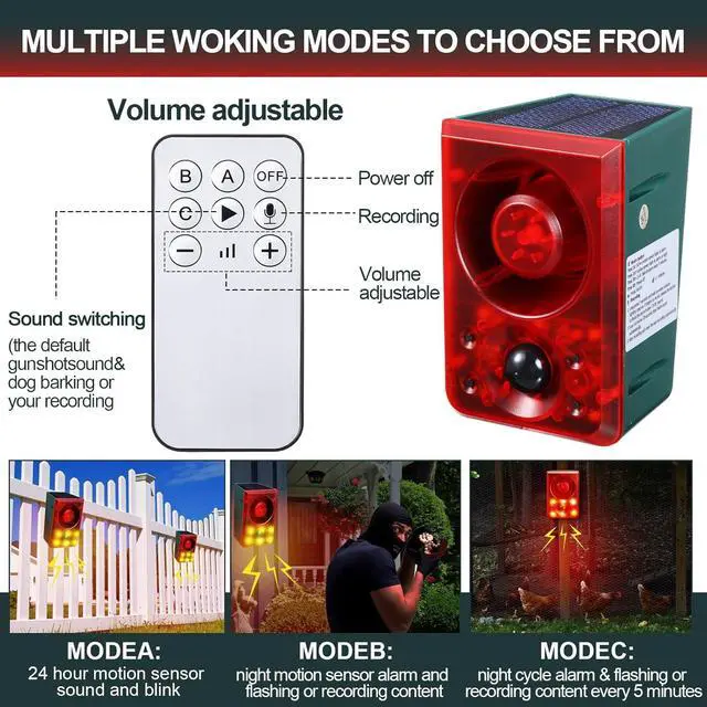Multiple Modes to Choose from: A: 24 hour motion sensor sound and blink, B: night motion sensor alarm and flashing or recording content, C: night cycle alarm and flashing or recording content every 5 minutes; You can choose different modes according to your needs
