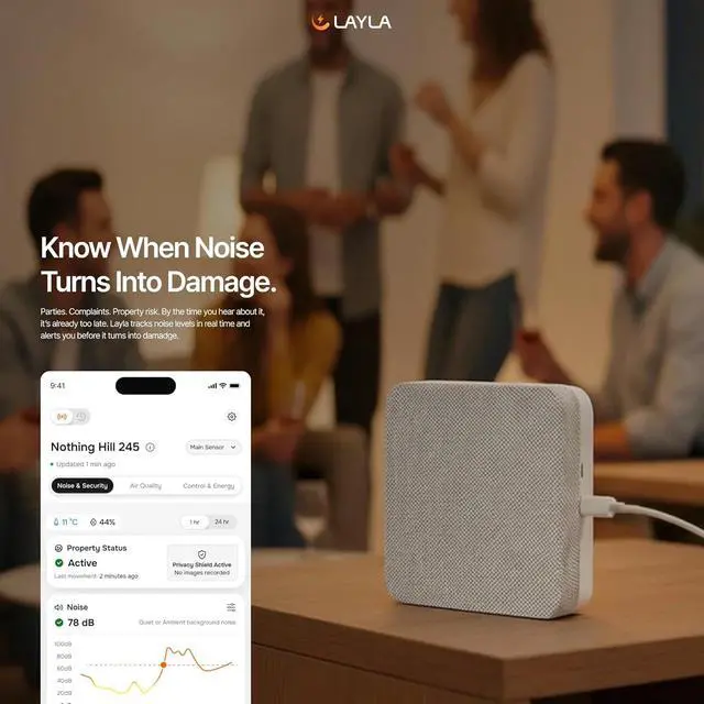 Layla Noise Monitoring Device: Accurately tracks sound levels to help maintain a calm, secure, and well-managed property environment. Designed to detect excessive noise in real time, allowing hosts or property managers to take action before issues escalate. Ideal for protecting your property, neighbors, and guest experience without being intrusive.