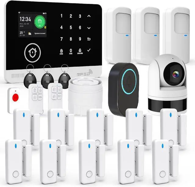 23-Piece Premium Kit- Security alarm system includes: 1 control panel (main unit), 1 camera, 3 motion sensors, 10 door/window sensors, 3 RFID cards, 2 remote controls, 1 doorbell button,1 sos button and 1 siren, this professional alarm system provides 24/7 protection for your home.