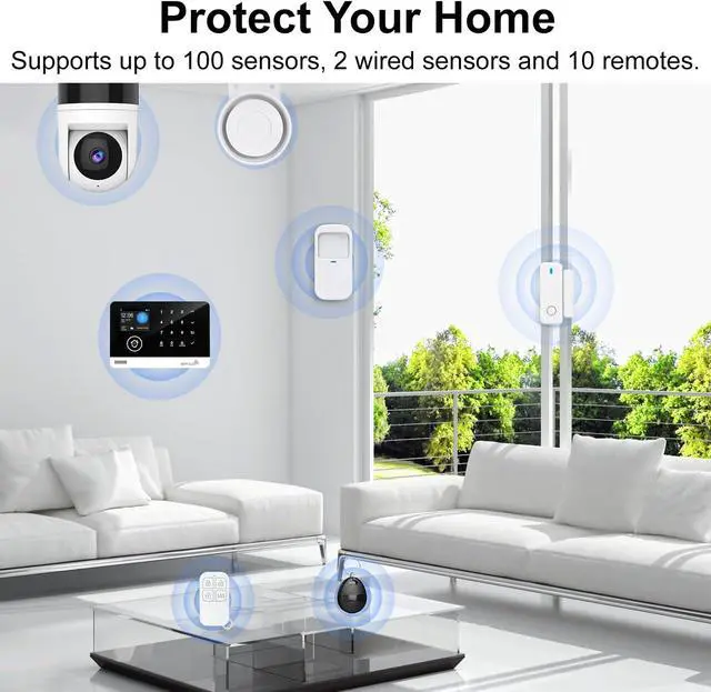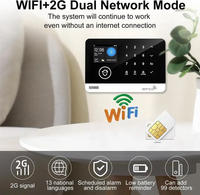 2.4GHZ WiFi + GSM Dual Network Mode- TUGARD wifi door alarm system utilizes Wi-Fi wireless 2.4G (Not support 5G Wifi) and GSM network technology. Support for Wi-Fi APP home alarm push network alarm, SMS, voice monitoring, main network and other multi-channel alarm methods to ensure stable and reliable alarm performance. 100 wireless zones, 10 remote controls, and 10 RF cards can be randomly added.