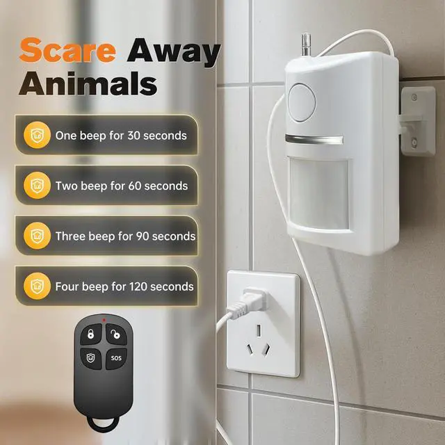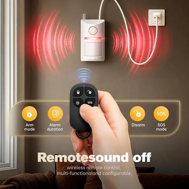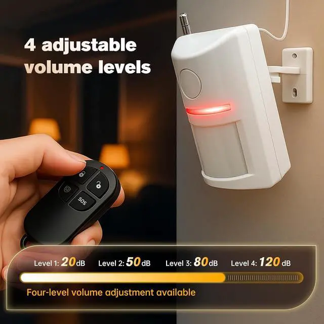 CUSTOMIZABLE ALERTS & REMOTE CONTROL: Tailor the system to your needs with 4 adjustable volume levels and 4 alarm duration settings ranging from 30 to 120 seconds. Includes a long-range wireless remote (over 300ft in open areas) allowing you to arm, disarm, or trigger an emergency SOS alarm instantly from a distance.