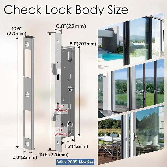 Measure Before You Buy: 2885 Slim FitConfirm these 3 critical dimensions for a perfect fit: SSliding Door Thickness: 13/15" - 4-3/4"(22-120mm). Door Frame Width: 1.8"(45mm )wide. Clearance: 10mm from frame to lock edge, 28mm to cylinder center. Ideal for slim sliding, patio, and glass doors. Confirm your measurements for a perfect fit.