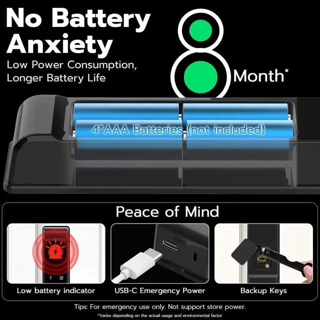 Long-Lasting Power & Reliable BackupEngineered for efficiency, this smart mortise lock runs on just 4*1.5V AAA batteries (not included) for up to 8 months of typical use. A low-battery alert on the keypad and in the App ensures youre never surprised by a dead battery. For complete peace of mind, weve included an emergency USB port for temporary power and two keys, so youre never locked out. (Note: The USB port provides temporary power for unlocking, not for recharging the batteries.)