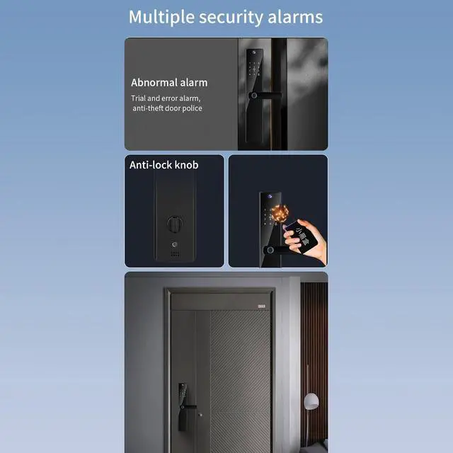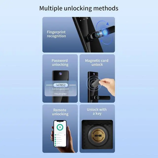 Versatile Unlocking Options: This keyless entry door lock allows for various unlocking modes, including fingerprint recognition, password input, card swipe, key access, remote unlocking, and temporary password granting. Choose the mode that suits your preference and enjoy the convenience and flexibility it brings.