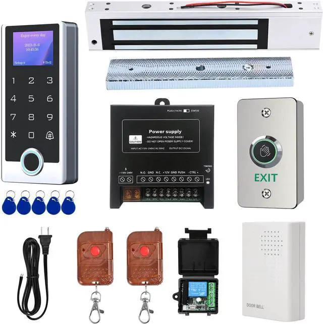 Complete Access Control Kit - Includes stainless steel keypad, 600lb electromagnetic lock, power supply control, waterproof exit button, remote controls, doorbell, and power cord - everything you need for a full door access system.