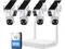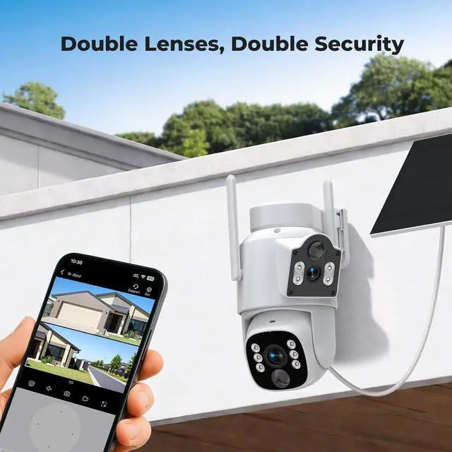 Dual-Lens Solar Security CameraAn outdoor wireless camera featuring dual lenses. The fixed top lens offers 180° manual adjustment, while the bottom lens supports 355° pan and 90° tilt via the app for flexible viewing angles. Four solar-powered cameras provide dual-screen live views, helping to minimize blind spots across your propertyall without complex wiring.