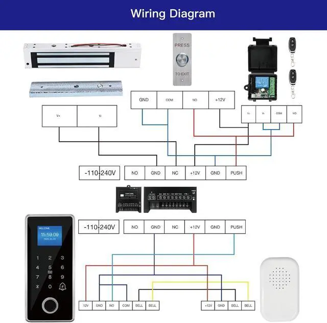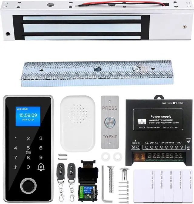 Complete Access Control Solution Package includes magnetic lock, IP68 keypad, AC110V to DC12V power supply, exit button, remotes, and RFID cards all components required for quick setup.