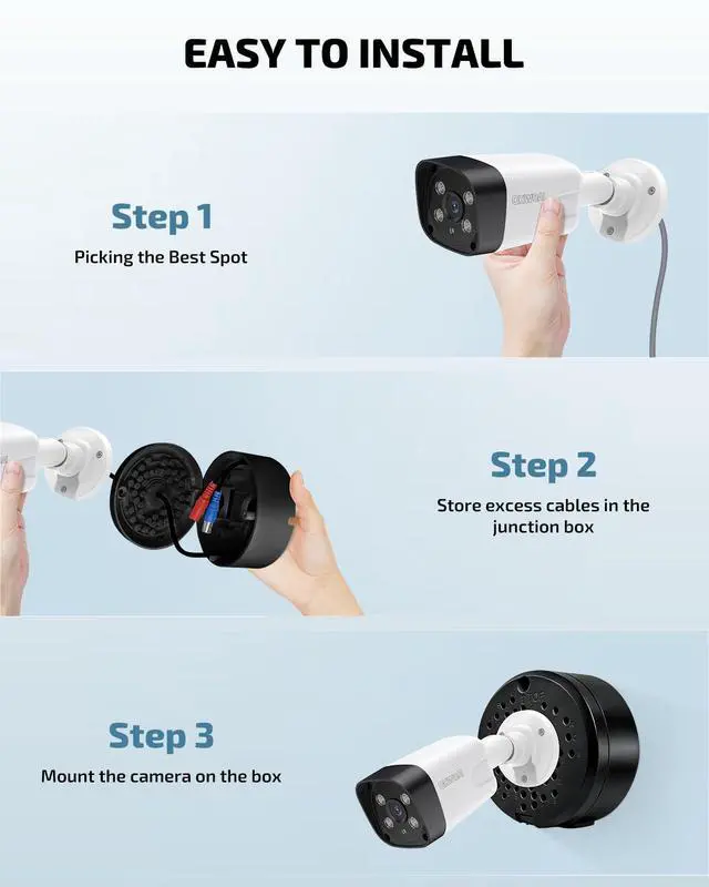 Simple InstallationStart by securing the camera junction box to the wall with screws. Next, run the extra wiring through the center hole of the security junction box. Finally, snap the cover on, and youre all set! This simple process lets you easily mount your security camera while keeping your wiring neat and tidy.