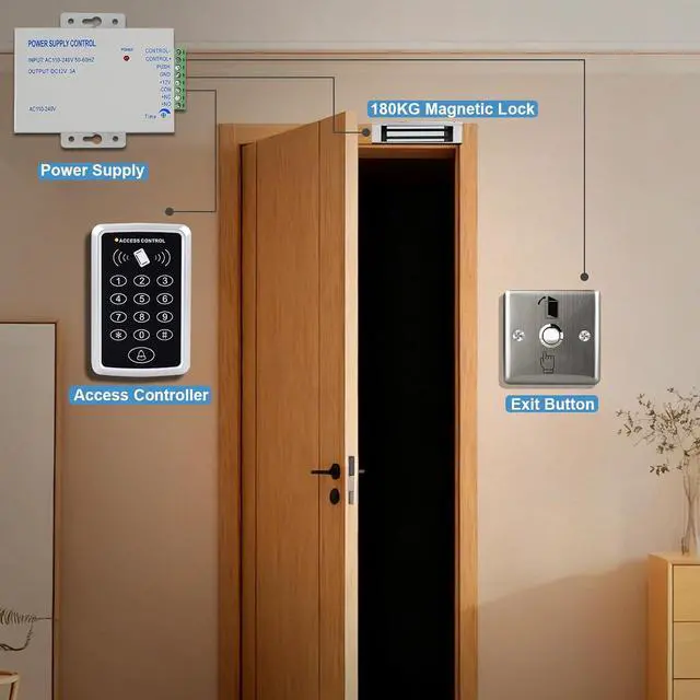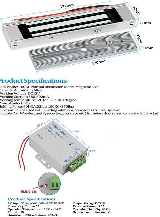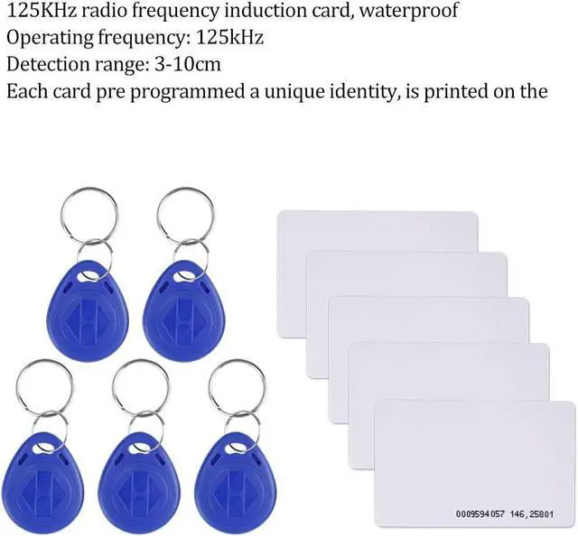 "6.Package Contents: 1 x Access Control Panel 1 x Power Supply 1 x Door Switch 1 x Electric lock 10 x 125KHZ ID KeychainBlue/5x125KHZ ID Keychain+5x125KHZ ID White Card 1 x User manual"