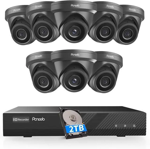 Overview: This poe security camera system includes one 4K 8 Channel POE NVR and 8x 5MP PoE cameras, one 2TB HDD built-in for storage. All cameras with 2.8mm lens around 110 degrees wide view angle, pretty and strong full-metal housing, waterproof IP67, perfect for indoor and outdoor use, built-in microphone for one-way audio.