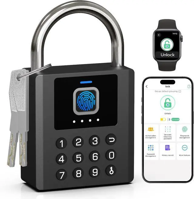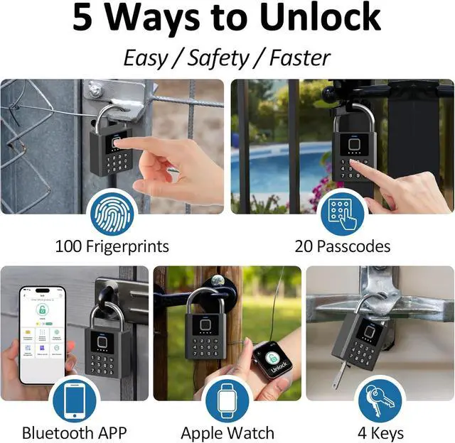 5-in-1 Fingerprint PadlockSmart Padlock has 5 unlocking ways, 100 fingerprints + 20 passcodes + Bluetooth App + iWatch unlock + Key unlock saying goodbye to the trouble of keys and passwords. Padlock can be easily operated by a simple touch on the fingerprint pad, and quickly unlock in 0.2s.