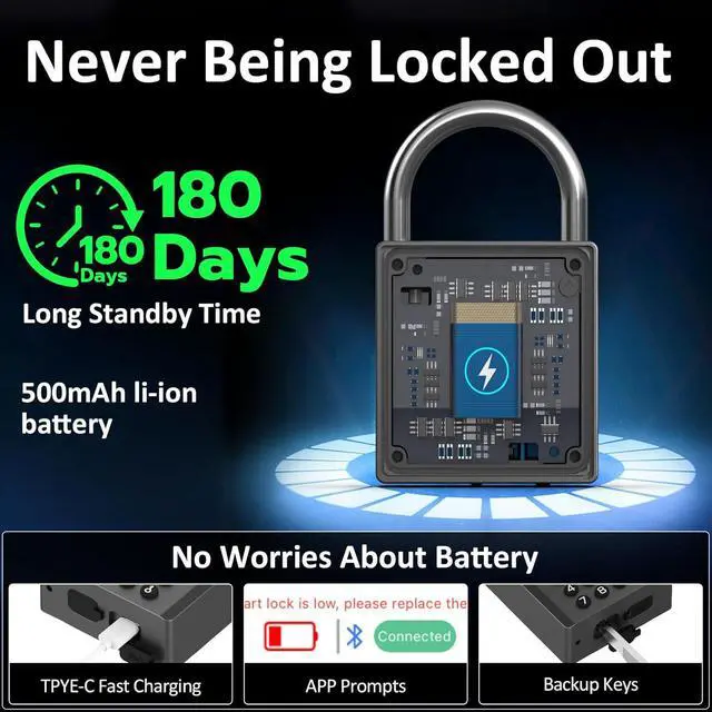 Long Battery Life & Low Battery ReminderSmart combination padlock has low power consumption and a long standby time. Use the USB cable with a power-bank, laptop or tablet when out of battery.