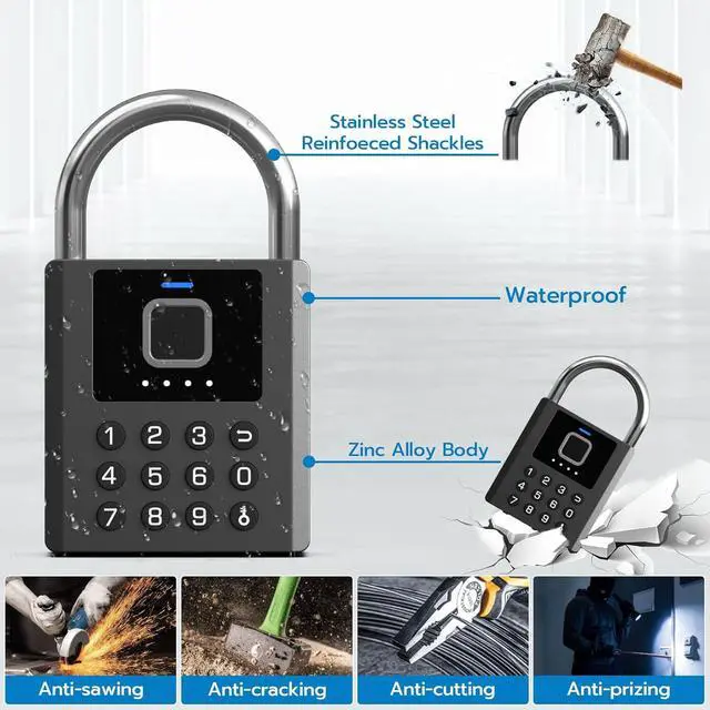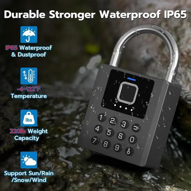 Military-Grade QualityMade of alloy steel + zinc alloy for extreme strength, smart lock with pry-resistant design, reinforced by durable steel construction that withstands ordinary cutting tools, protect your private property. Equipment with a waterproof rubber stopper to prevent water from entering the charging port at the bottom of the lock. NOTE: The lock does not support immersion in water for a long time, please keep the lock dry when unlocking.