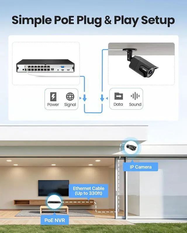 (2). [ Plug and Play PoE Camera System ] __ A truly plug-and-play system designed for easy setup. Just connect the PoE IP camera to the NVR using an Ethernet cable for both power and data transmission, offering greater stability and reliability compared to wireless systems. With eight additional channels available, you can expand your monitoring setup by adding ZOSI 2MP, 4MP, 5MP, or 8MP PoE IP cameras.