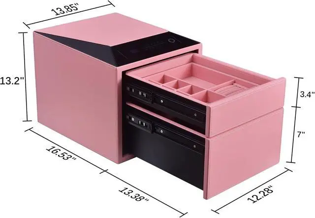 Spacious & Customizable InteriorWith dimensions of 13.85"×13.2"×16.53", this home safe box features removable jewelry organizers to store necklaces, bracelets, or small items. Remove the dividers to convert it into a house safe for firearms. Simply press the button for your selected drawer level, and it pops open instantly