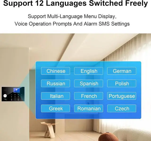 Wireless Home Alarm System Kit: 2.4 inch IPS color screen, real-time main interface status bar, the data and clock are displayed, and the status of the host is very clear. It supports multilingual menus, voice commands and SMS alerts.
