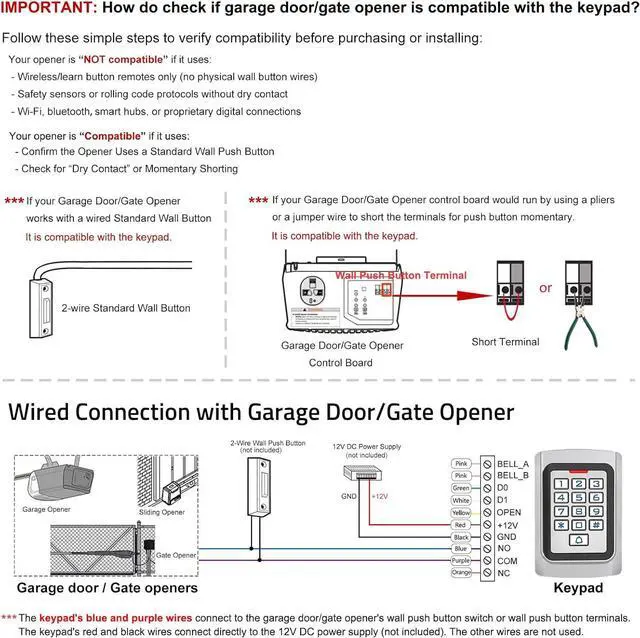 Wide CompatibilityWired keypad compatible with most brands of gate openers and garage door openers (whose control board accepts a Dry Contact signal or can be controlled by a momentary push button switch). It can also be used with magnetic lock, strike lock and access control systems. Note: Models whose connection protocol is Wi-Fi, learn buttons, safety sensors, rolling code are not currently supported! It uses a wired connection directly to the opener's push button terminals.