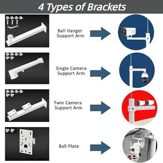 Upgrade your camera setup with our versatile Bracket Set, featuring 4 Types: Ball Camera Bracket, Dome Camera Bracket, Single Camera Bracket, and Double Camera Bracket. Designed for various installations, including Closed-Circuit Television Cameras and Pan/Tilt/Zoom Cameras. Enhance your security system effortlessly and ensure optimal performance with these durable and reliable brackets.