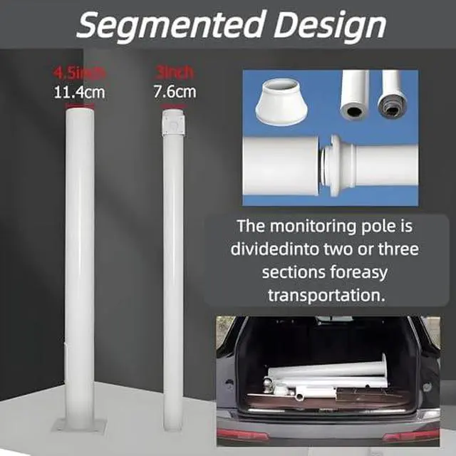 The Wide View Security Camera Pole features a segmented assembly design for customizable height options (2.5 m / 8.2 ft to 6 m / 19.6 ft), ensuring optimal coverage and minimizing obstructions like trees and vehicles. Its innovative 4-Way Panel design allows for comprehensive monitoring across multiple areas simultaneously, enhancing security and visibility in various environments.