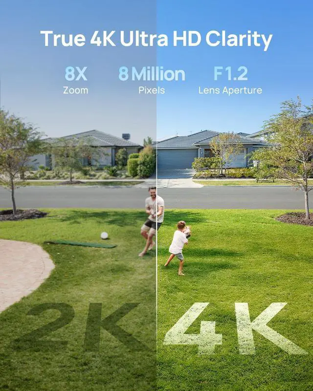 4K UHD Vision & Color Night VisionAurora solar security cameras wireless outdoor captures every detail with stunning 4K resolution and 8 megapixels, giving you crystal-clear visibility and reliable security, day and night. Equipped with a starlight sensor and an F1.2 large aperture, Aurora provides vibrant color night vision even in low-light conditions.