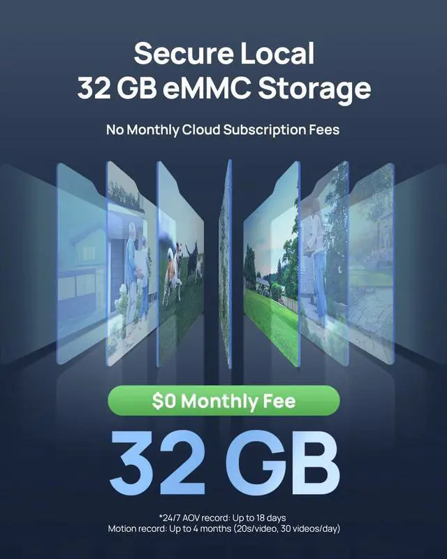 32GB eMMC Local StorageUnlock effortless storage with Aurora's 32GB eMMC, capable of holding over 4 months of playback. Forget extra SD cards or cloud feesyour memories are secure and accessible, saving you data and money.Please note that it only supports 2.4GHz WiFi, not 5G wifi, like most cameras on the market!!!