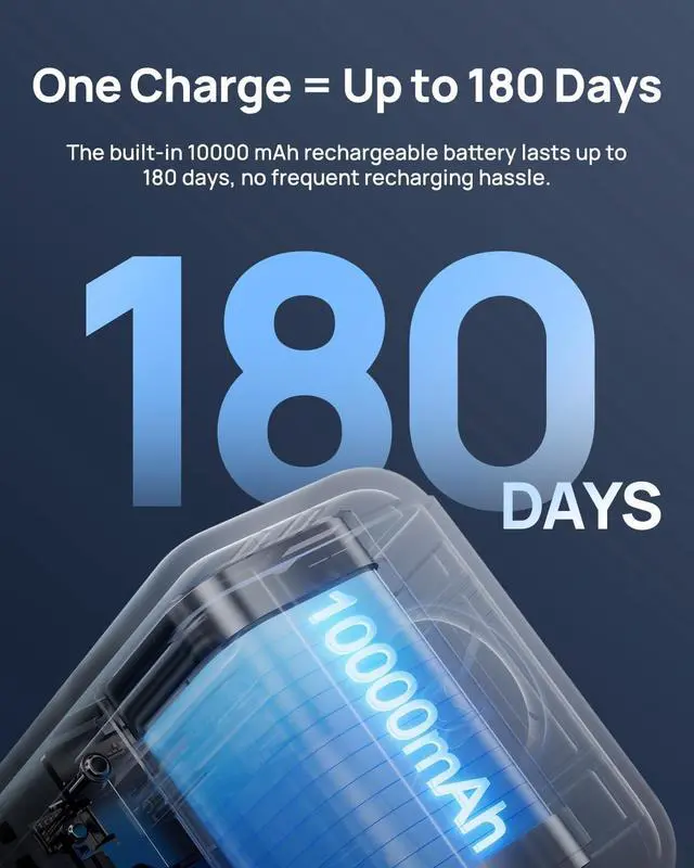 More Power, Less PluggingEquipped with a 10000mAh large capacity battery, Aurora offers approximately 180 days of operation on a single charge. When paired with Anona 4.8W solar panel, it harnesses clean, renewable energy, ensuring virtually limitless power. Paired with the Anona 4.8W solar panel(sold seperately), with at least 2 hours of daily sunlight exposure.