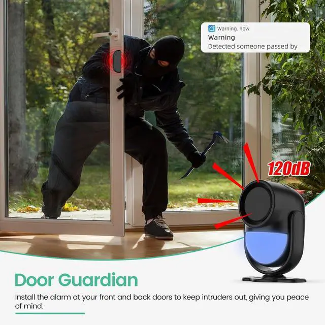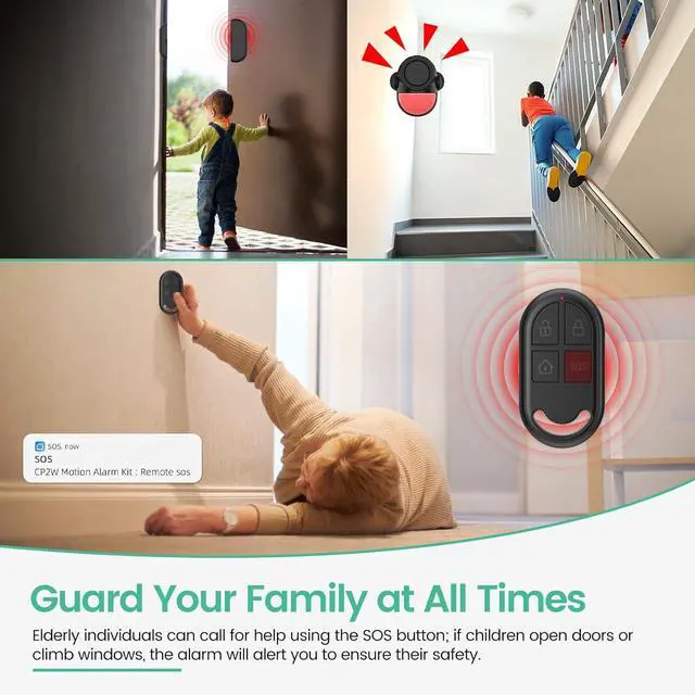 Multi-Function&DIY InstallationThis indoor motion sensor alarm has two modes, Doorbell mode and Alarm mode. The remote integrated panic button, when you press the button of "SOS", the host will alarm immediately. The alarm station should ALWAYS CONNECT to AC adapter via the cable in the package. The backup batteries of the alarm hub works for 8 hours, only as an emergency battery.